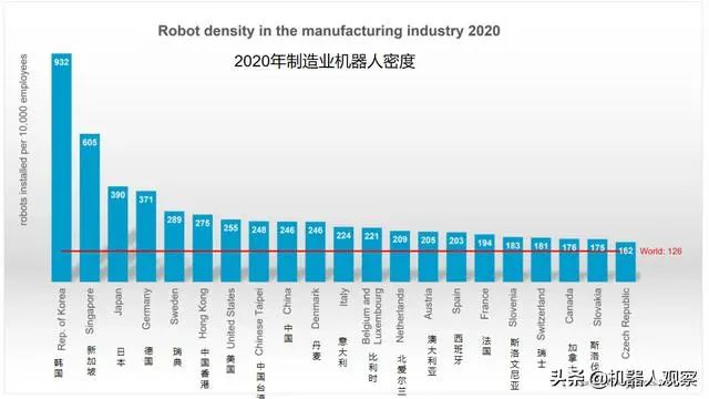 2020年,全球每10000名制造业劳动人口平均使用126个机器人,同比与2015年的数据,66个/每万人劳动人口,提升了两倍。而中国工业机器人密度,从2015年的49台每万人,增长至246台每万人。