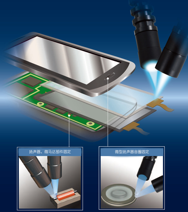 典型的微型扬声器一般包括音膜,音圈,盆架,磁极,磁芯,磁缸等。所有这些小零件都是用胶粘接而组装起来的。一个小小的微型扬声器有时用胶近达8处之多。正因为如此,业内人士都有一个不成文的说法,那就是做微型扬声器其实是在做胶。这足以证明胶在微型扬声器中的作用。但使其胶快速固化一直是业内人士头疼的问题,一般的固化设备都会释放多大量的热量,会对微型扬声器零件产生损坏,是一种冷光源固化机,快速固化的同时不会对设备造成损坏。